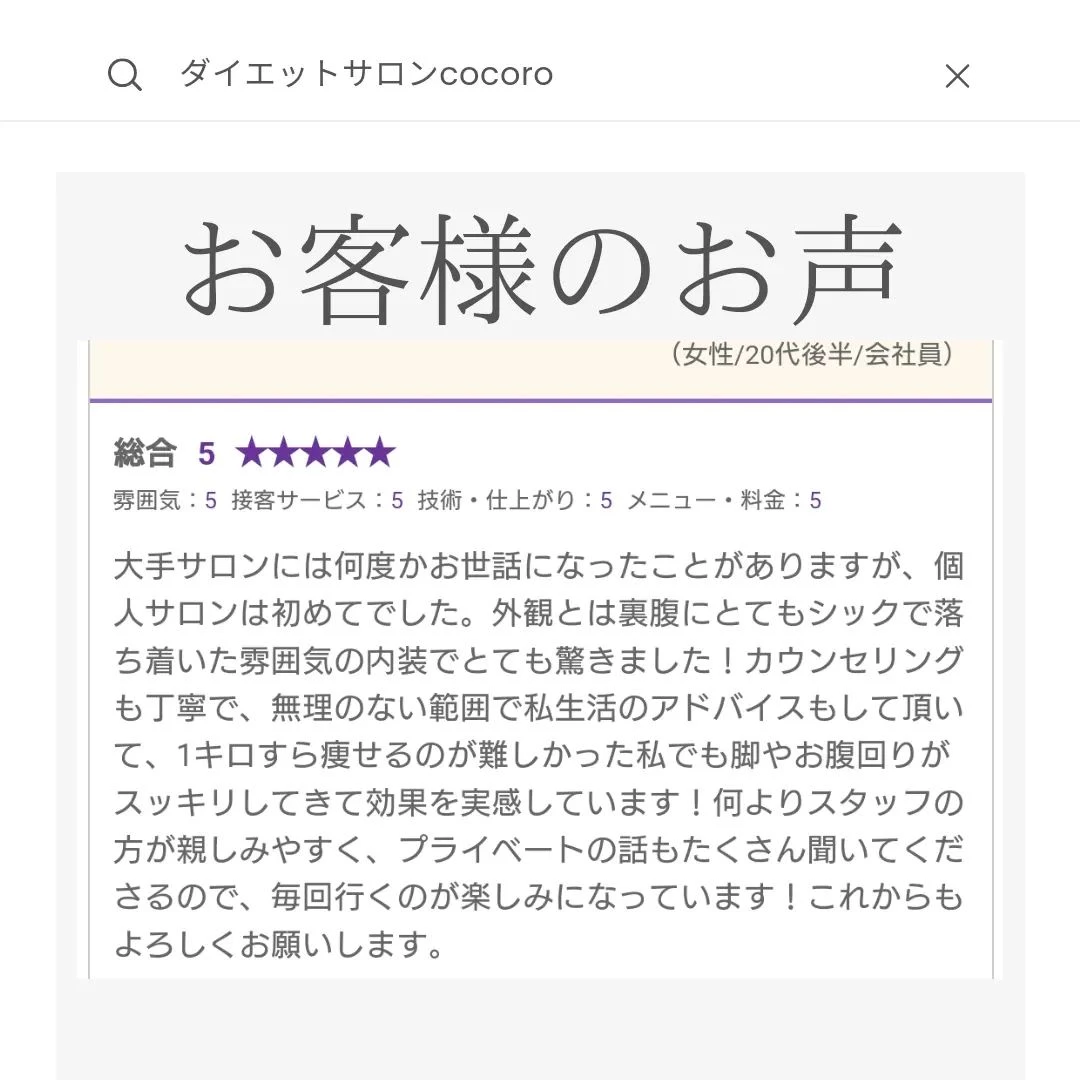 【スタイル骨盤矯正】お客様のお声 【スタイル骨盤矯正】お客様のお声こんにちはダイエットサロンcocoroです!嬉しいクチコミありがとうございます✨スタイル骨盤矯正では、全身の筋肉・筋膜を緩め骨盤を正しい位置に戻すことで小尻・美脚を…